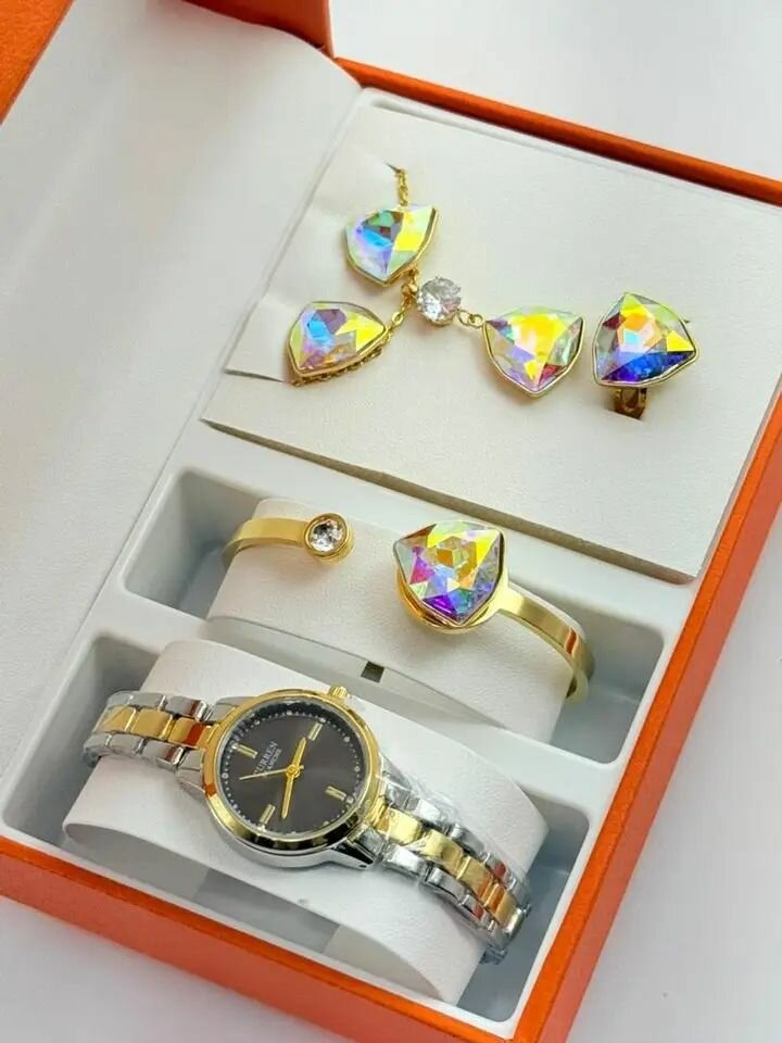 Découvrez cet ensemble élégant comprenant une montre et des bijoux pour femme. Conçu pour les occasions spéciales, cet ensemble comprend une montre en acier inoxydable avec un cadran noir, un bracelet en or, des boucles d'oreilles et une bague ornés de cristaux. Parfait pour les femmes qui aiment le luxe et la sophistication.