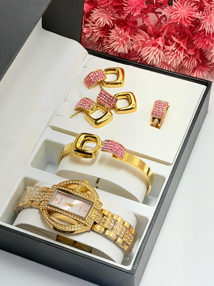 Élégant ensemble montre et bijoux pour femme, parfait pour les occasions spéciales. Inclut une montre dorée sertie de pierres et des bijoux en métal doré avec détails roses. Idéal pour ajouter une touche de glamour à n'importe quelle tenue.