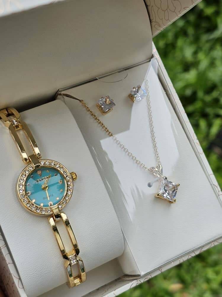 Cet ensemble féminin raffiné inclut une montre dorée élégante avec cadran bleu, et un collier avec pendentif orné de pierres éclatantes. Parfait pour ajouter une touche de luxe à toute tenue. Idéal pour offrir ou se faire plaisir.