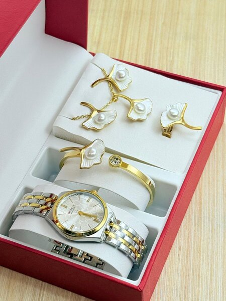 Découvrez cet ensemble élégant comprenant une montre et des bijoux assortis. Idéal pour les occasions spéciales, cet ensemble de luxe comprend une montre dorée avec un cadran blanc et des bijoux ornés de strass. Parfait pour les femmes qui apprécient l'élégance et le raffinement.