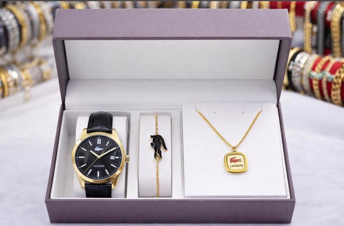 Découvrez cet ensemble élégant comprenant une montre noire avec cadre doré, un collier pendentif personnalisable et un bracelet en or. Un cadeau idéal pour les occasions spéciales.