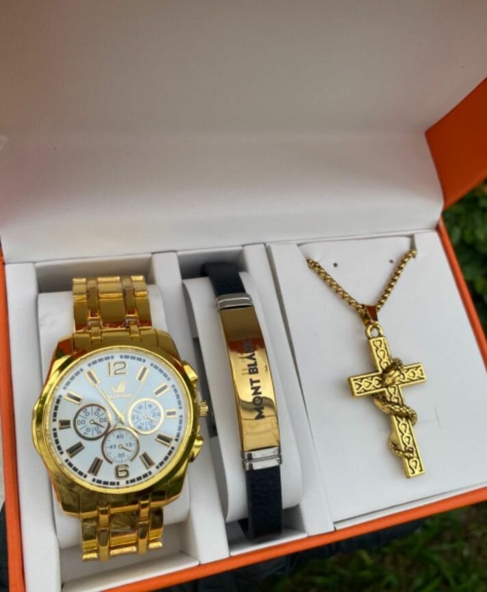 Découvrez cet ensemble élégant comprenant une montre homme en or, un bracelet et un collier croix. Conçu pour les hommes modernes qui aiment le luxe et la précision, cet ensemble est idéal pour les occasions spéciales ou comme cadeau.