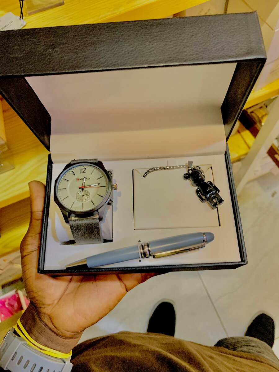 Cadeau idéal pour les hommes, cet ensemble comprend une montre élégante, un stylo raffiné et une chaîne de qualité. Parfait pour les occasions spéciales.