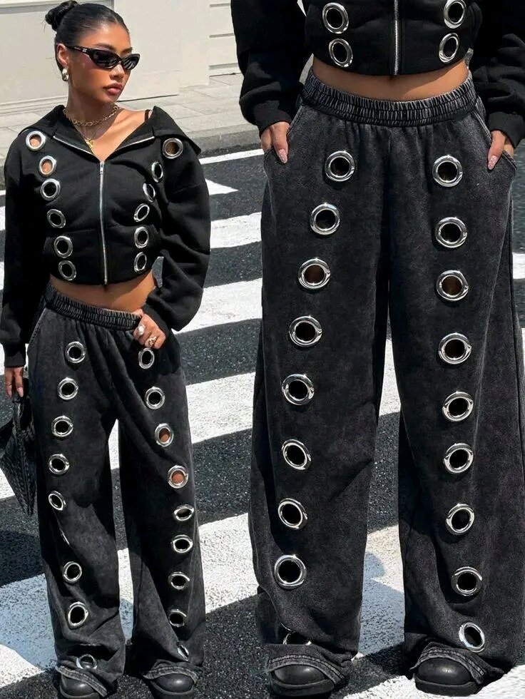 Optez pour un look audacieux avec cet ensemble noir à œillets. Parfait pour les sorties urbaines, ce design unique attire tous les regards. Confortable et tendance, c'est le choix idéal pour celles qui veulent se démarquer.