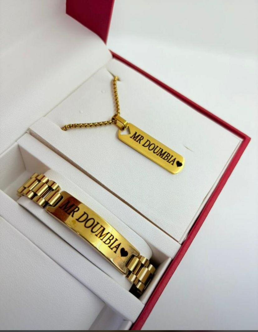 Ensemble élégant de bracelet et collier personnalisés avec gravures significatives. Parfait pour les cadeaux, ces bijoux d'exception apportent de la personnalité et de l'élégance à chaque tenue. Un choix idéal pour exprimer votre affection à votre partenaire