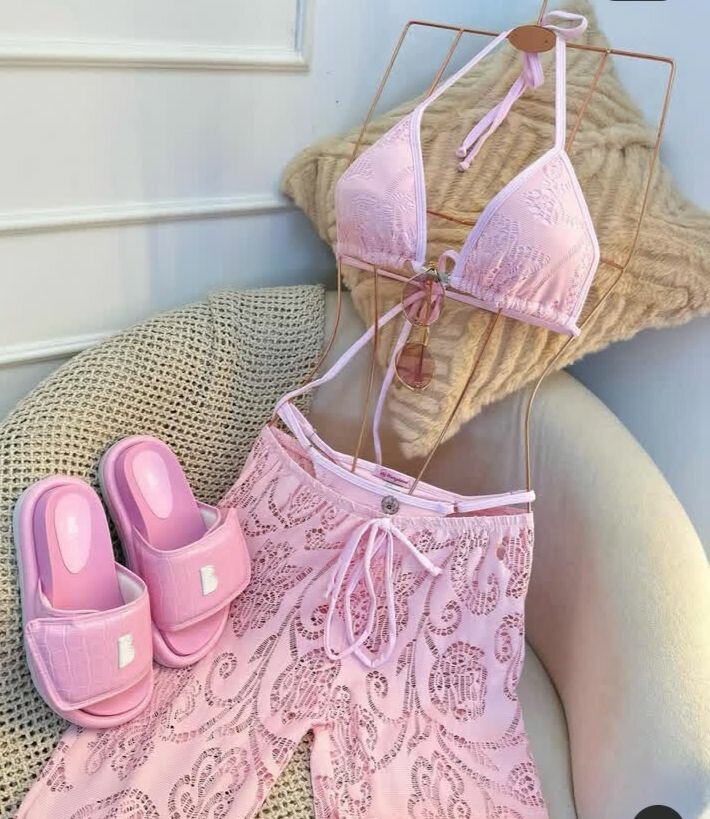 Cet ensemble de plage rose inclut un bikini élégant et un pantalon en dentelle pour un look estival tendance. Parfait pour les journées ensoleillées, il offre confort et style. Ajoutez-y des sandales pour compléter votre tenue et profitez de la plage avec confiance.