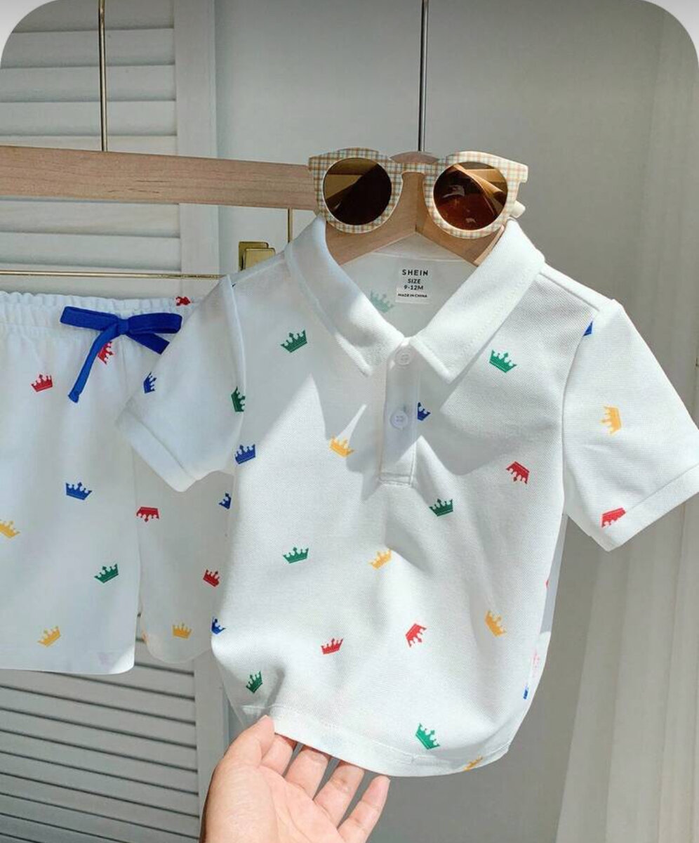 Cet ensemble polo en coton pour bébé est orné de motifs de couronnes colorées, parfait pour un look mignon et stylé. Idéal pour les sorties estivales, il offre confort et élégance grâce à sa coupe légère et son tissu doux. Un choix incontournable pour vos petites aventures!