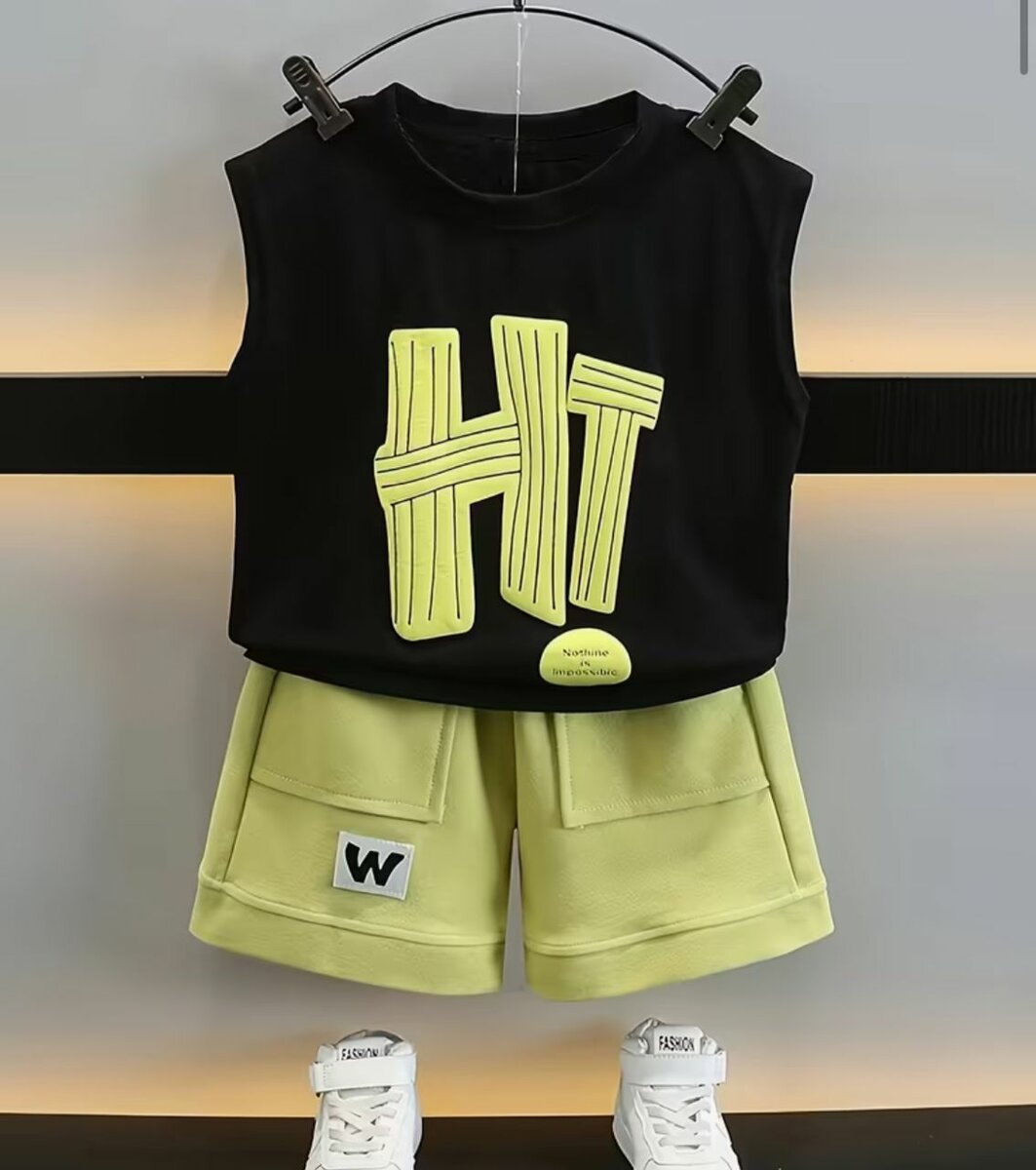 Adoptez un look tendance avec cet ensemble d'été pour enfants. Le t-shirt sans manches noir avec un imprimé graphique "HT" contraste parfaitement avec le short jaune vif pour un style décontracté. Idéal pour les journées chaudes, cet ensemble offre confort et style. Parfait pour jouer ou se balader, il deviendra rapidement un incontournable de la garde-robe d'été de votre enfant.