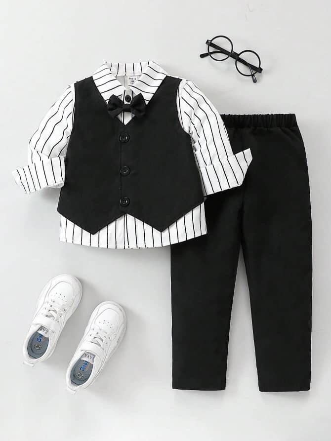 Découvrez cet ensemble élégant pour garçon, parfait pour des occasions spéciales. Comprend une chemise rayée, un pantalon noir et un gilet chic. Confortable et stylé, idéal pour les petits gentlemen.