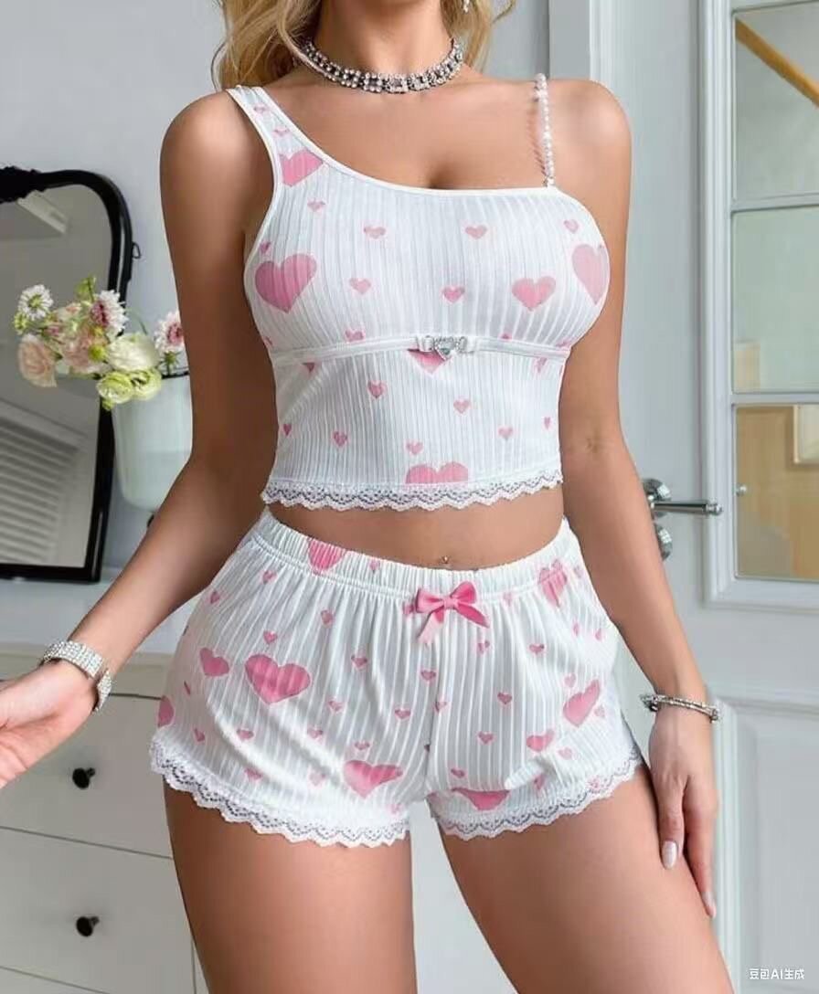 Découvrez cet ensemble pyjama féminin à motifs de cœurs roses, idéal pour des nuits confortables. Confectionné dans un tissu doux et respirant, cet ensemble est composé d'un haut à bretelles et d'un short assorti, parfait pour l'été. Sous les signes de l'élégance et du confort, c'est le choix parfait pour se détendre à la maison.
