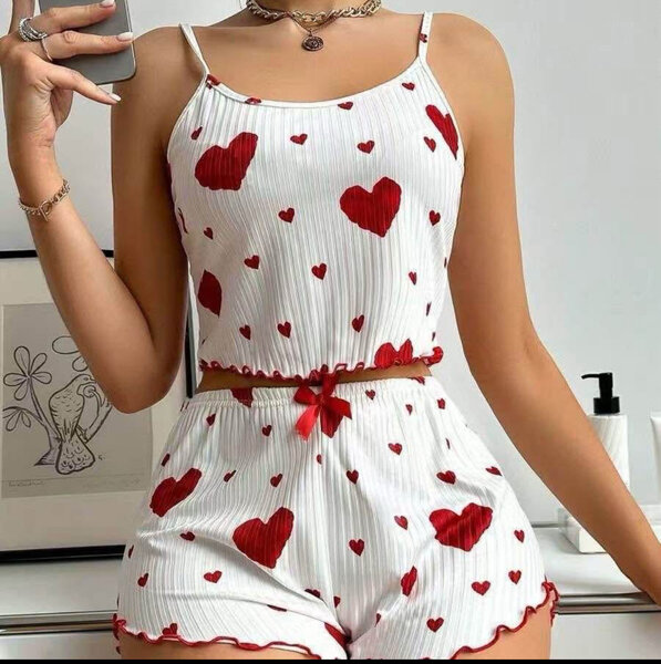 Pyjama confortable pour femme, ensemble débardeur et shorts à motifs cœurs rouges. Idéal pour la maison ou pour dormir. Tissu doux et agréable.