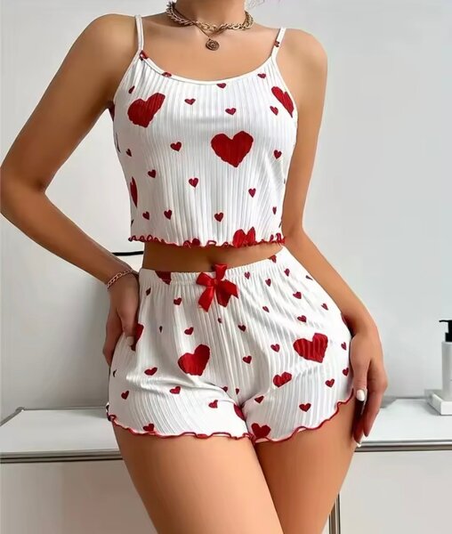Découvrez cet ensemble pyjama d'été élégant avec un haut rose sans manches et des shorts à imprimé cœur. Fabriqué en coton doux, il est parfait pour des nuits confortables. Idéal pour se détendre à la maison avec style.