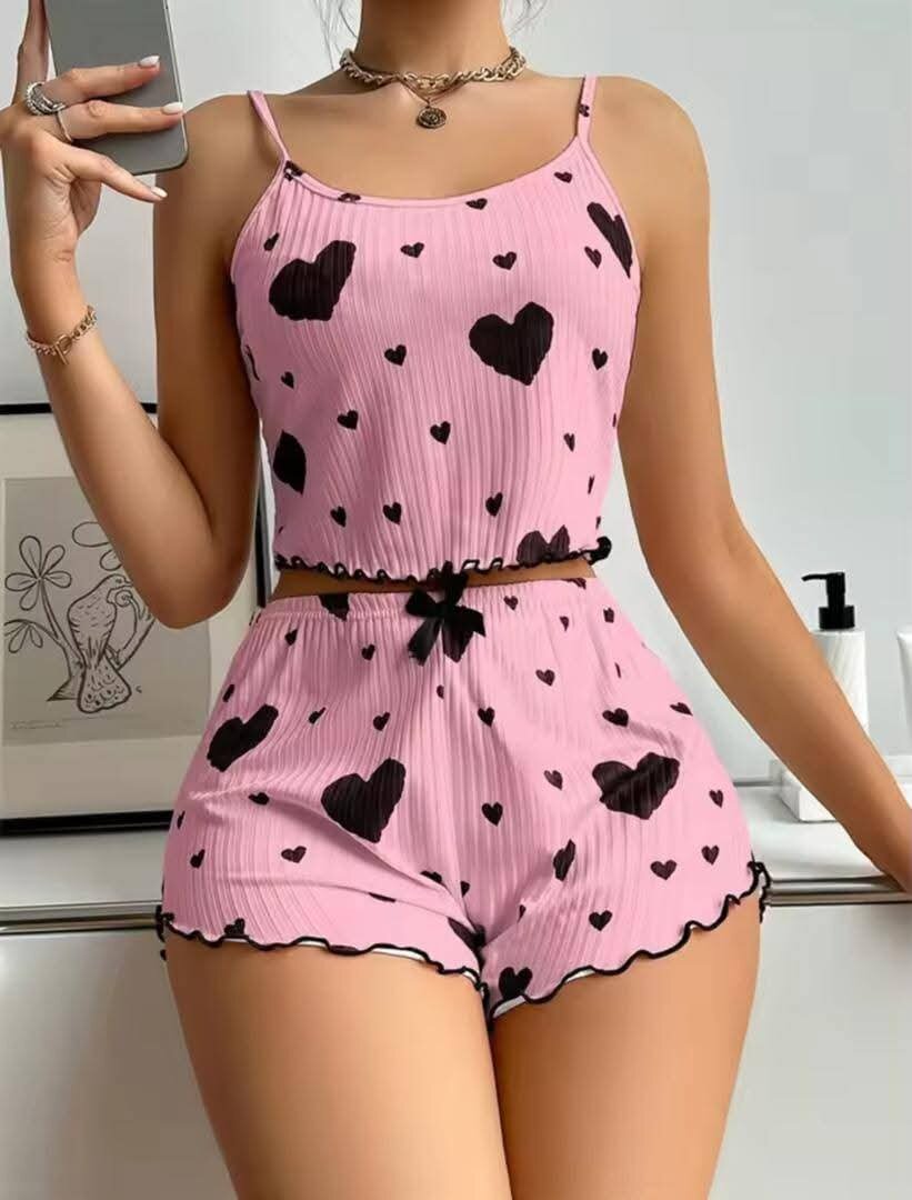 Craquez pour cet ensemble pyjama pour femme avec imprimé cœur, idéal pour des nuits confortables. Composé d'un débardeur et d'un short, ce set est parfait pour un sommeil paisible. Disponible en plusieurs couleurs, il est conçu pour offrir douceur et style. Préparez-vous à des soirées cocooning stylées chez vous !