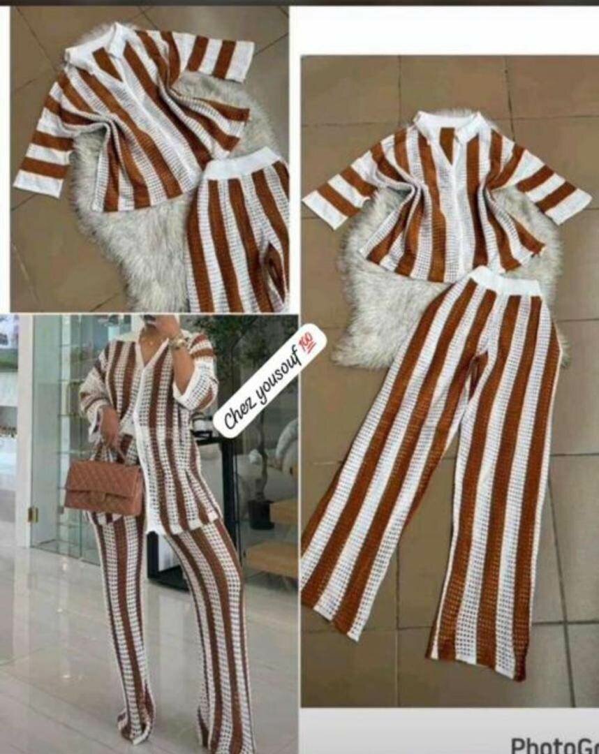 Optez pour un look audacieux avec cet ensemble rayé marron et blanc pour femme. Idéal pour des sorties décontractées ou un brunch entre amis, cet ensemble confortable et élégant saura vous démarquer. Fabriqué avec des matériaux de qualité pour un confort optimal et un style assuré.