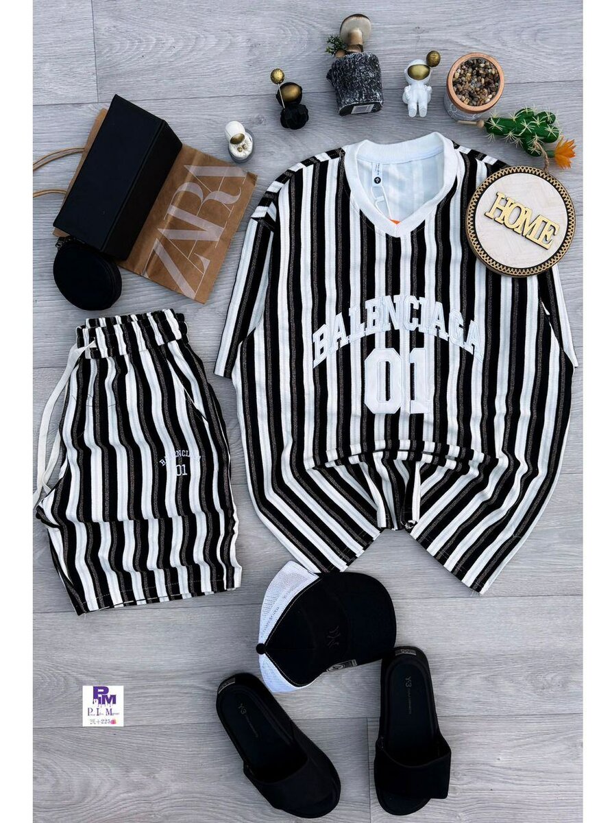 Découvrez cet ensemble décontracté rayé noir et blanc, idéal pour un look à la fois chic et confortable. Parfait pour vos sorties décontractées, cet ensemble se compose d'un haut ample et d'un short assorti. Complétez votre tenue avec des accessoires pour un style unique.