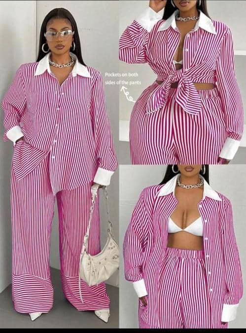 Ce magnifique ensemble rayé rose et blanc est parfait pour un look chic et décontracté. Conçu avec un tissu confortable, il comprend une chemise à nœud et un pantalon ample avec poches. Idéal pour toutes vos sorties estivales!
