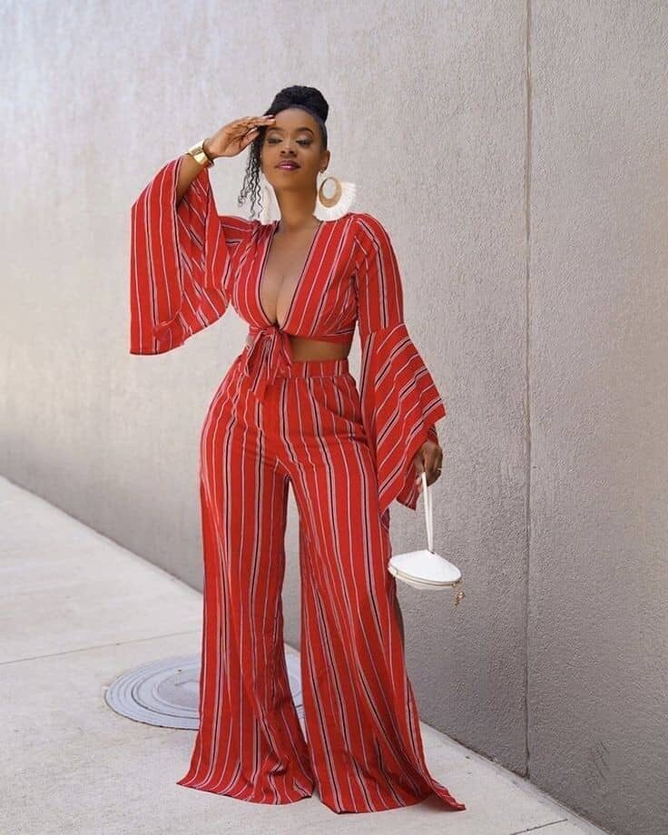 Éblouissez avec cet ensemble deux pièces rayé rouge, parfait pour une soirée ou une sortie entre amis. Avec ses manches évasées et son décolleté plongeant, ce look apporte un style audacieux et branché. Confortable et chic, il est idéal pour celles qui souhaitent se démarquer avec élégance. Associez-le à des accessoires dorés pour un look encore plus glamour!