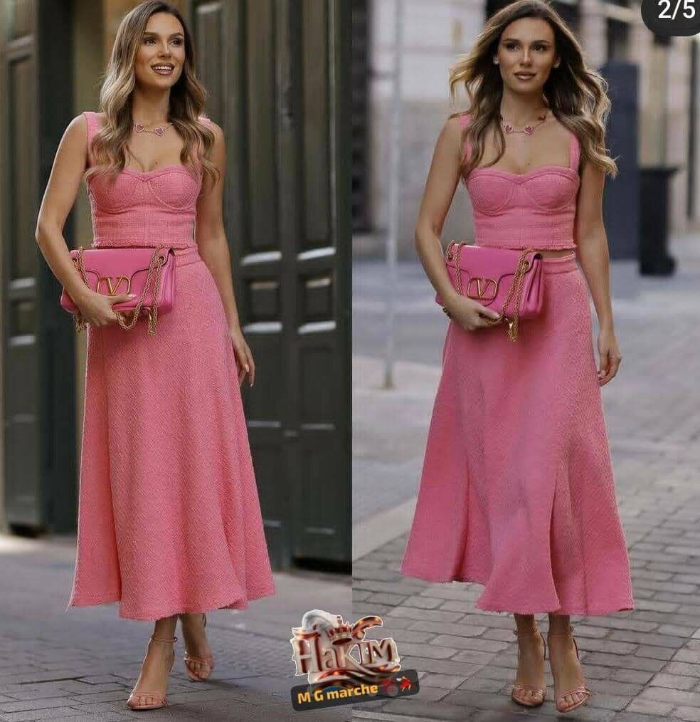 Élégant ensemble rose avec un top bustier flatteur et une jupe fluide. Idéal pour les occasions spéciales ou un look estival chic. Tissu texturé pour un confort optimal et une silhouette raffinée. Parfait pour les soirées, les fêtes ou une promenade décontractée.