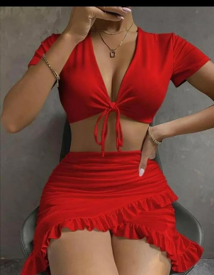 Éblouissant ensemble rouge comprenant un haut noué et une jupe à volants, idéal pour soirées et événements spéciaux. Tissu doux et élastique pour un confort exceptionnel.