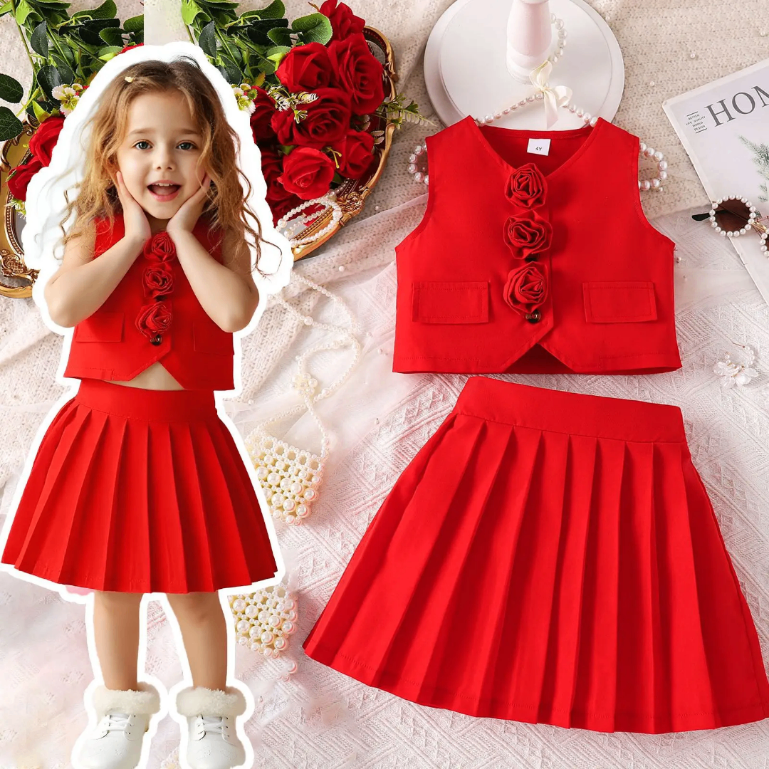 Cet ensemble rouge élégant, composé d'un gilet orné de roses et d'une jupe plissée, est parfait pour les petites filles qui veulent se démarquer lors d'occasions spéciales. Conçu pour offrir style et confort, c'est le choix idéal pour les fêtes ou les événements familiaux.