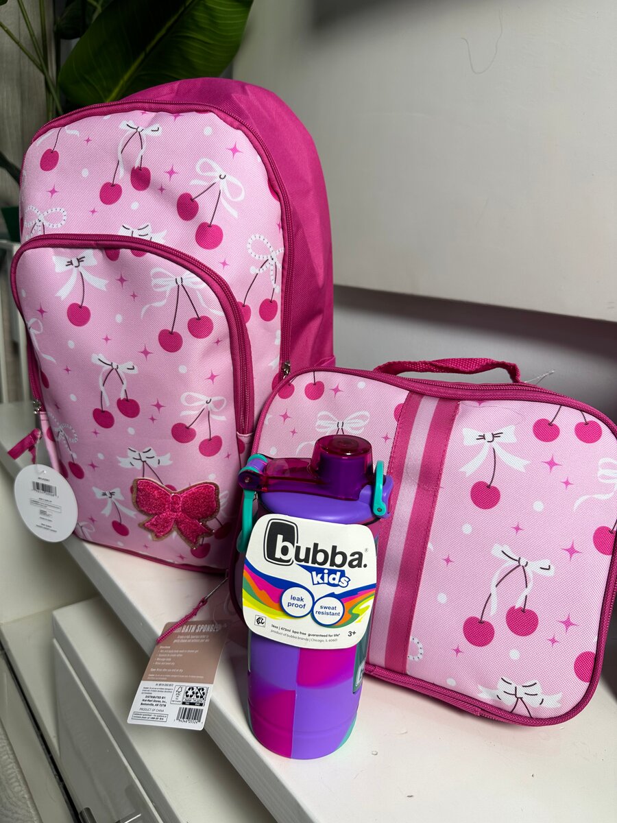 Adorable ensemble pour enfant avec sac à dos et boîte déjeuner assortis, motif cerises et papillons. Parfait pour l'école, alliant style et fonctionnalité.