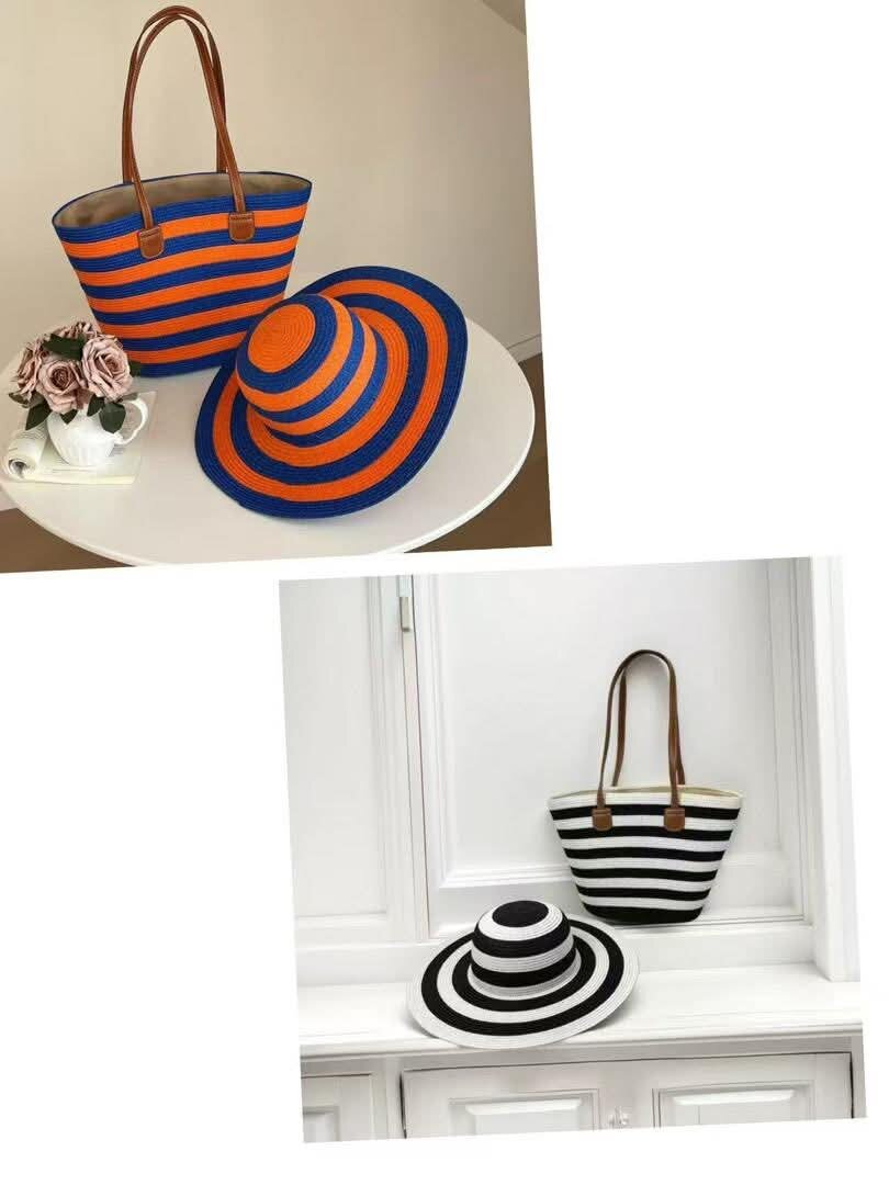 Magnifique ensemble de sac et chapeau en paille rayés, idéal pour une journée à la plage ou en ville. Confort et style assurés avec ces accessoires originaux et tendance. Disponible en plusieurs coloris.
