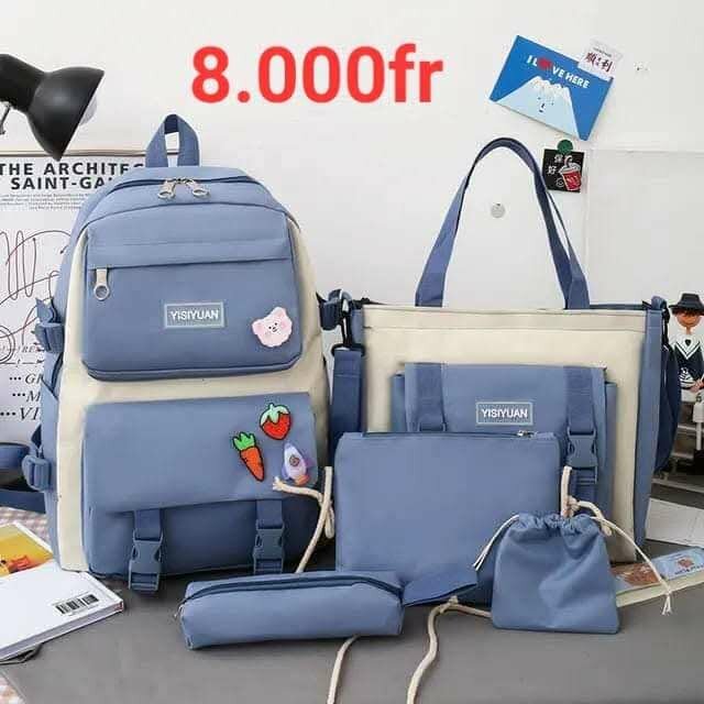 Découvrez cet ensemble de sacs à dos 5 pièces en bleu pastel, idéal pour les étudiants et les voyageurs. Comprend un grand sac à dos, un sac en bandoulière, une pochette, une trousse et un sac à cordon. Fabriqué pour le confort et le style, parfait pour l'école ou le quotidien.
