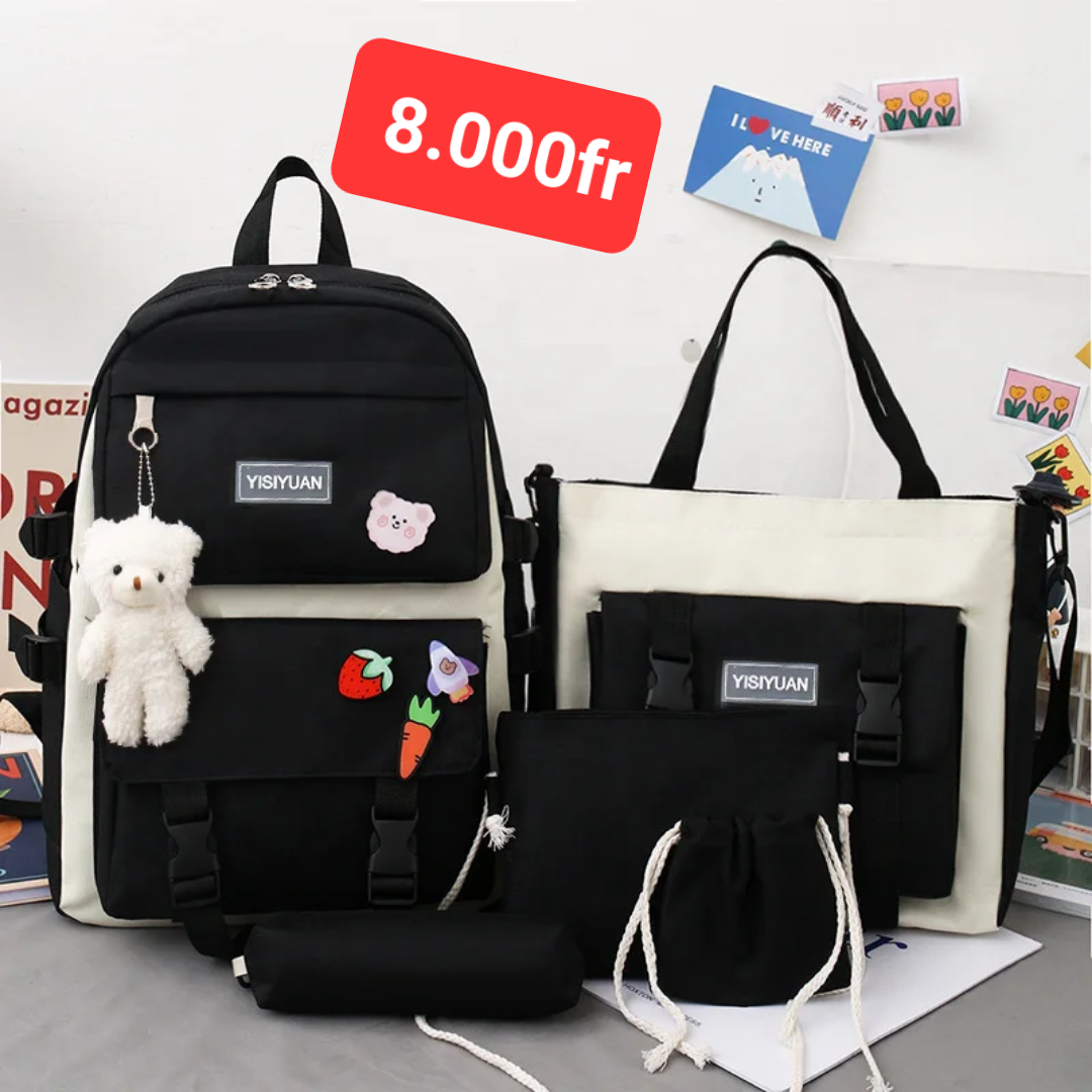 Découvrez ce magnifique ensemble de sacs idéal pour l'école ou les sorties. Composé d'un grand sac à dos, d'un sac à bandoulière, et de deux pochettes pratiques, cet ensemble est parfait pour organiser vos affaires avec style. Fabriqué en matériaux durables et au design moderne, il saura séduire les amateurs de mode.