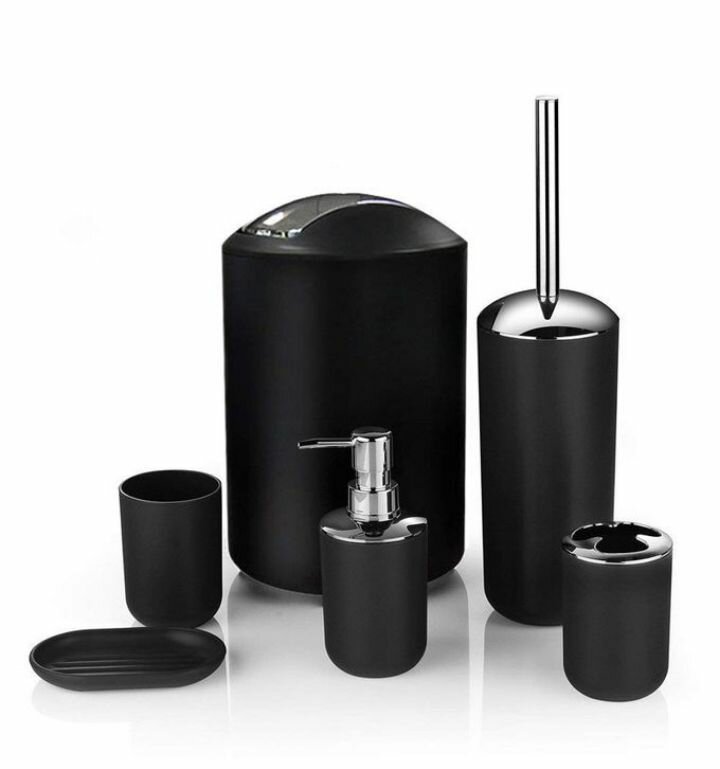 Transformez votre salle de bain avec cet ensemble d'accessoires modernes. Comprenant un porte-brosse élégante, une pompe à savon et plus, chaque pièce arbore un design minimaliste en noir et argenté qui rehausse n'importe quel décor. Parfait pour un look cohérent et sophistiqué.