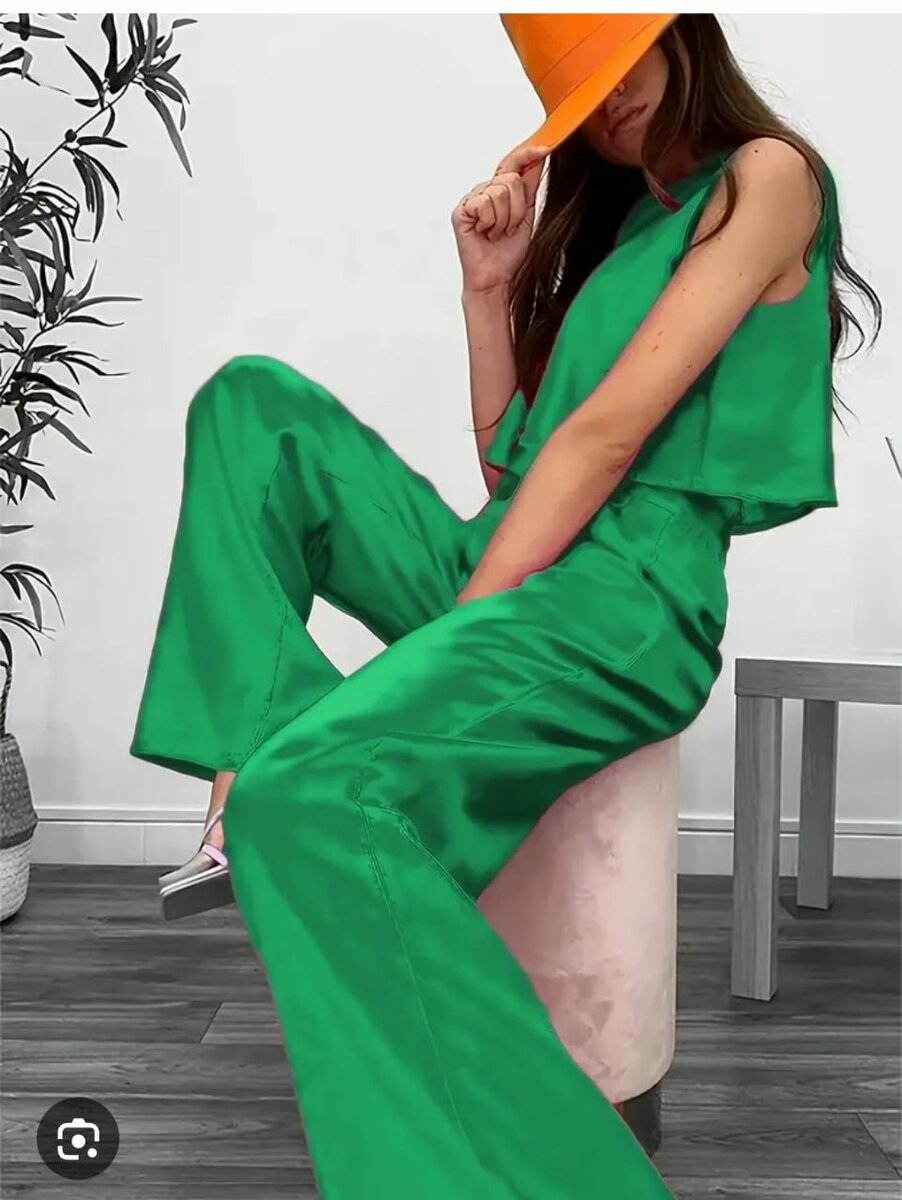 Cet ensemble en satin vert émeraude, composé d'un haut sans manches et d'un pantalon large, offre un style chic et raffiné. Idéal pour une soirée ou une occasion spéciale, il associe confort et élégance. Faites tourner les têtes avec cet ensemble tendance et luxueux.