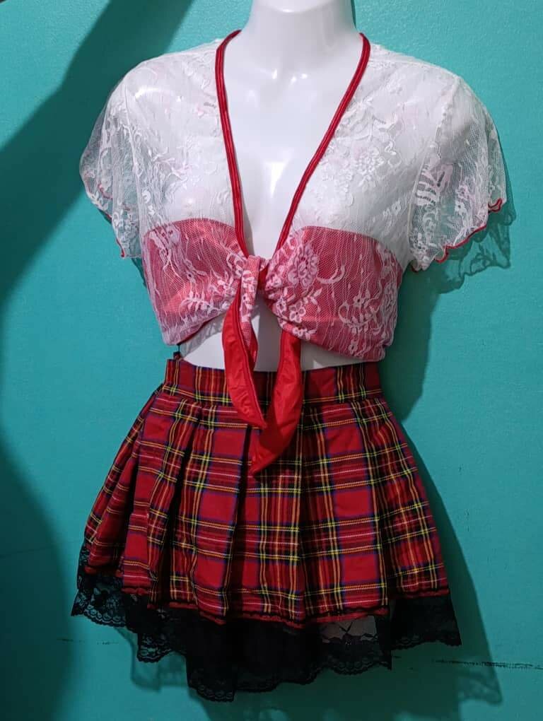 Cet ensemble sexy écolière est parfait pour des soirées spéciales. Composé d'une jupe à carreaux rouge et d'un haut en dentelle blanche noué à l'avant, il combine élégance et séduction. Idéal pour des occasions intimes ou des costumes thématiques.