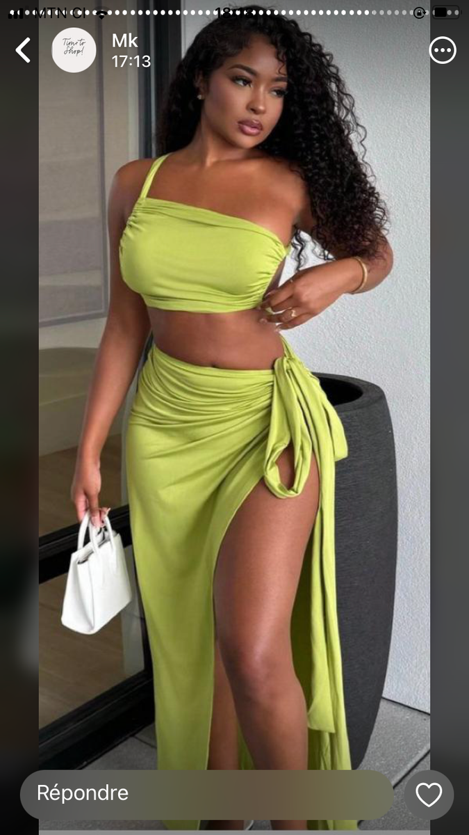 Optez pour cet ensemble vert séduisant, idéal pour un look estival chic. Le haut court asymétrique et la jupe fendue créent une silhouette audacieuse et élégante. Parfait pour les vacances et les soirées plage, ce duo offre confort et style, rehaussant votre allure avec sophistication.