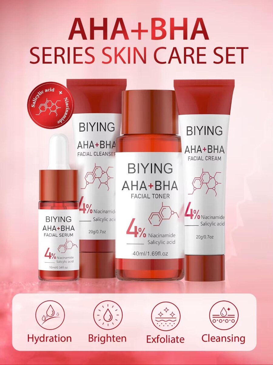 Découvrez notre set de soin visage AHA+BHA pour un nettoyage en profondeur, une exfoliation douce et un teint éclatant. Composé d'un nettoyant, tonique, sérum et crème, ce programme hydrate, illumine et unifie votre peau. Idéal pour tous types de peau, profitez d'une solution complète pour un soin quotidien efficace.