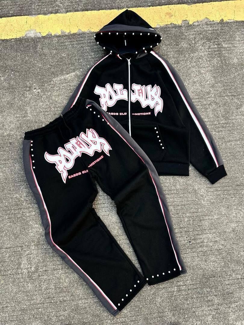 Ensemble de survêtement tendance pour un look sportif et urbain. Comprend une veste à capuche et un pantalon assorti, ornés de détails modernes et de motif graphique. Idéal pour le quotidien ou pour un style décontracté. Confort et style assurés.