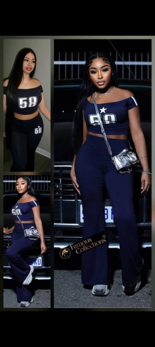 Optez pour cet ensemble sport chic composé d'un crop top et d'un pantalon évasé, idéal pour une allure décontractée et stylée. Fabriqué dans un tissu confortable et extensible, parfait pour une journée active ou une sortie entre amis. Disponible en bleu marine avec un design sportif numéroté pour une touche tendance.