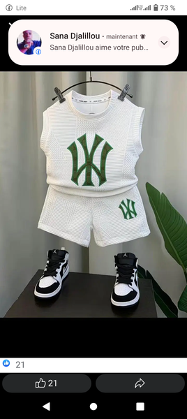 Ensemble sport enfant blanc avec motif vert, idéal pour le jeu et l'entraînement. Confortable et stylé, parfait pour les activités sportives.