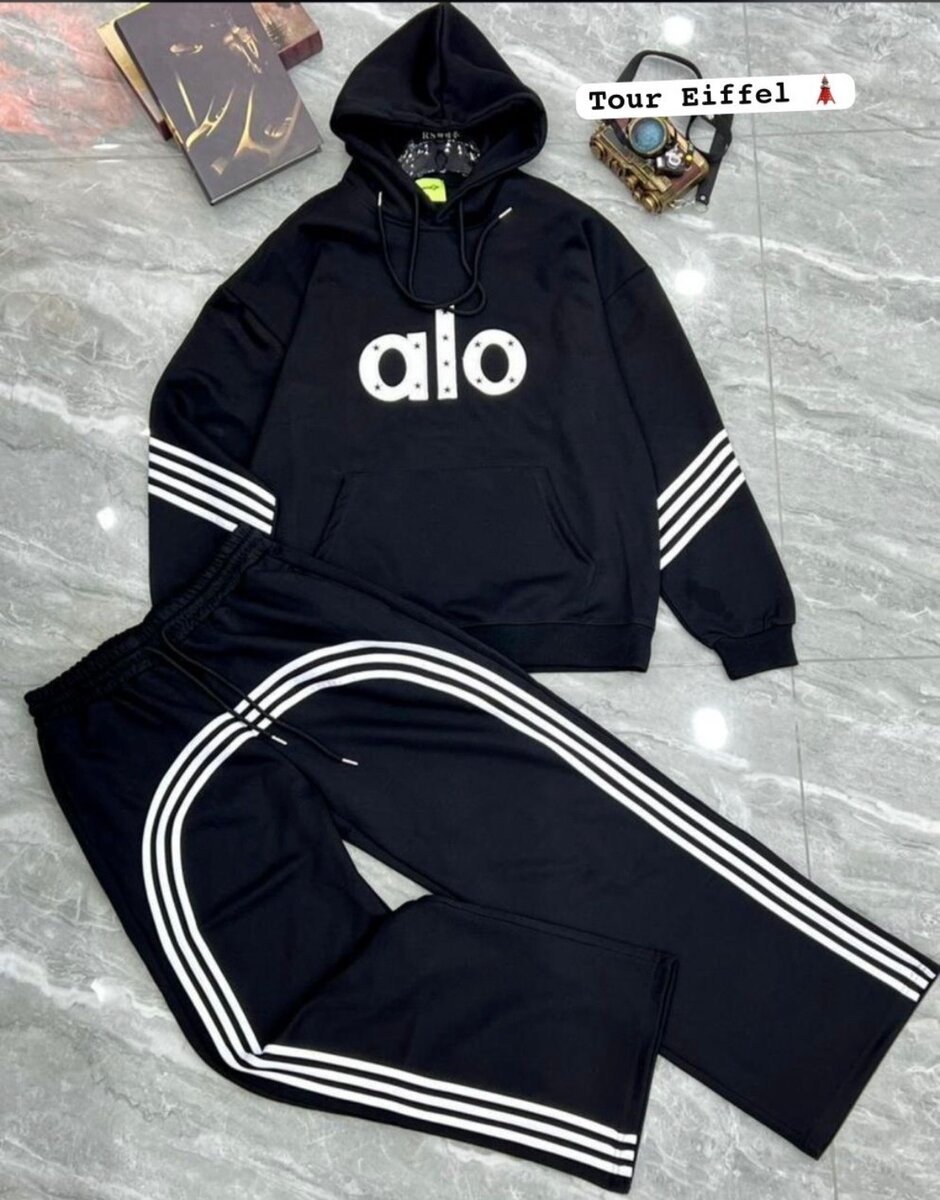 Ensemble sport moderne pour homme avec sweat à capuche et pantalon. Disponible en noir et gris, idéal pour l'entraînement et les loisirs. Confort et style garantis avec des rayures distinctives. Parfait pour le sport ou les sorties décontractées.