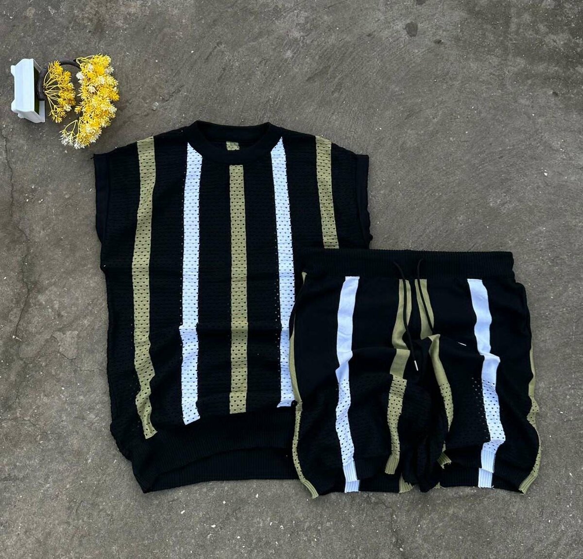 Cet ensemble sportif rayé en noir et or est parfait pour vos activités sportives. Conçu pour allier style et confort, il vous accompagnera lors de vos séances d'entraînement ou vos sorties décontractées. Fabriqué en matériaux respirants pour un maximum de confort.