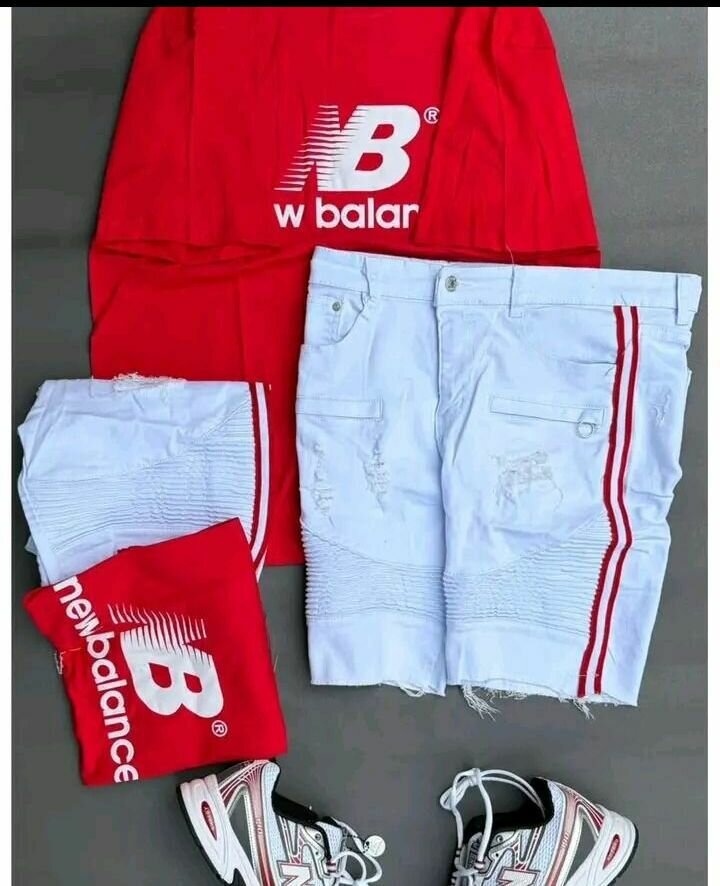 Ensemble sportif élégant composé d'un t-shirt rouge et d'un short blanc avec rayures rouges. Idéal pour les amateurs de mode active.