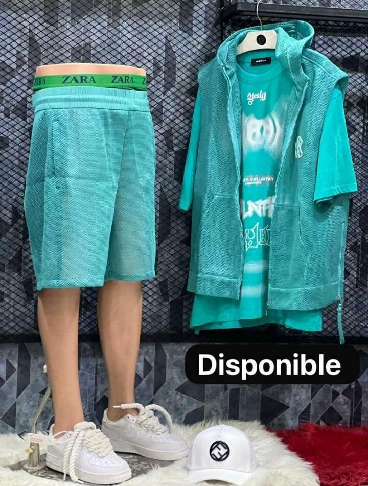Ensemble sport Zara pour hommes en turquoise, comprenant un t-shirt, un short, et une veste à capuche. Idéal pour l'été grâce à son tissu léger et respirant. Parfait pour les activités sportives ou une tenue décontractée.