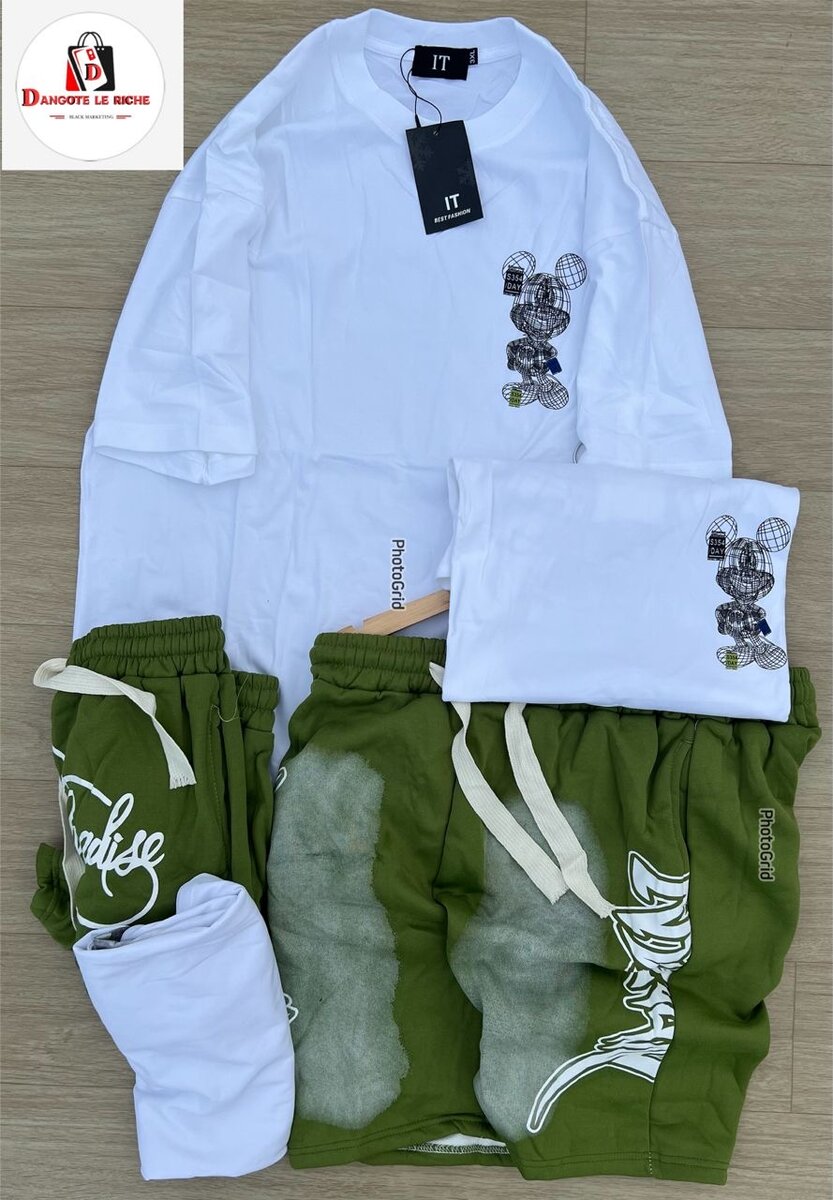 Découvrez cet ensemble sportif élégant et confortable composé d'un t-shirt blanc avec imprimé artistique et d'un short vert avec un design moderne. Parfait pour le sport et le quotidien. Fabriqué avec des matériaux de qualité pour un confort optimal. Idéal pour un style décontracté et tendance.