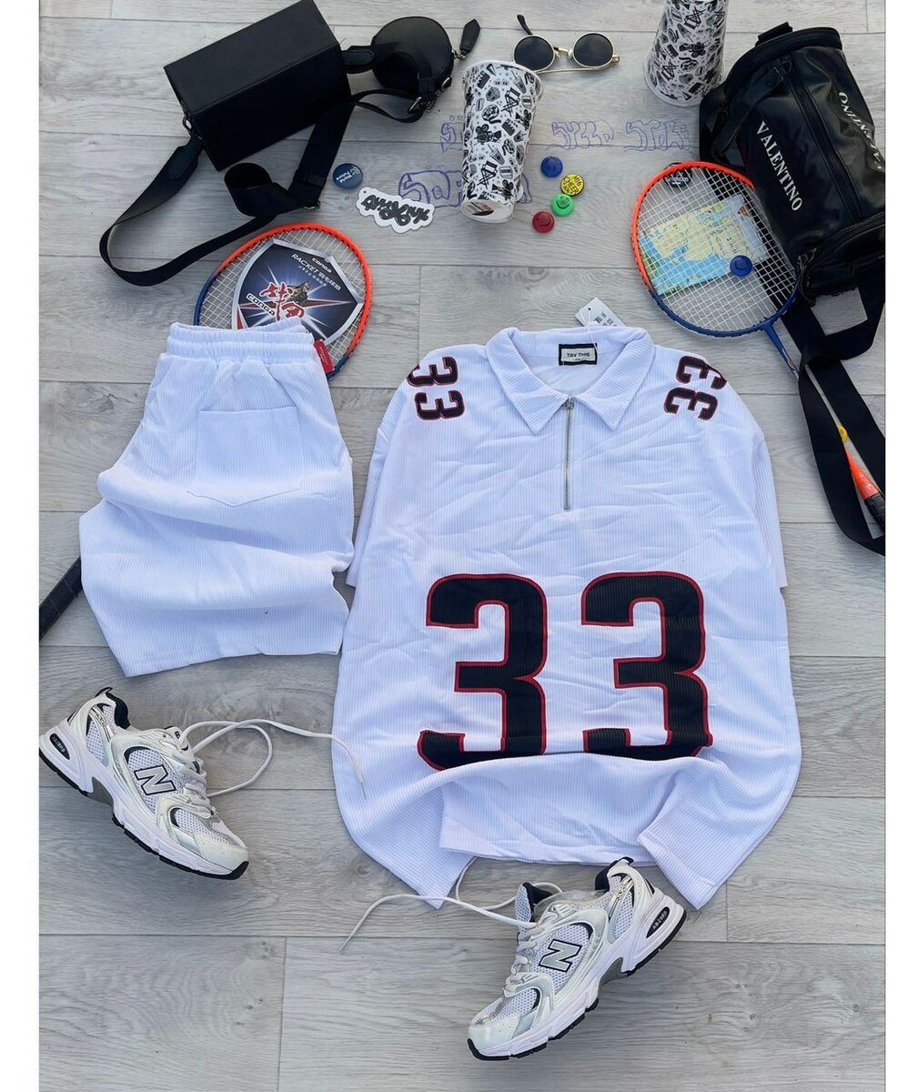 Optez pour cet ensemble sportif blanc, comprenant un maillot numéro 33, un short assorti et des baskets élégantes. Idéal pour le tennis ou un look décontracté sportif. Confortable et stylé pour toutes vos activités.