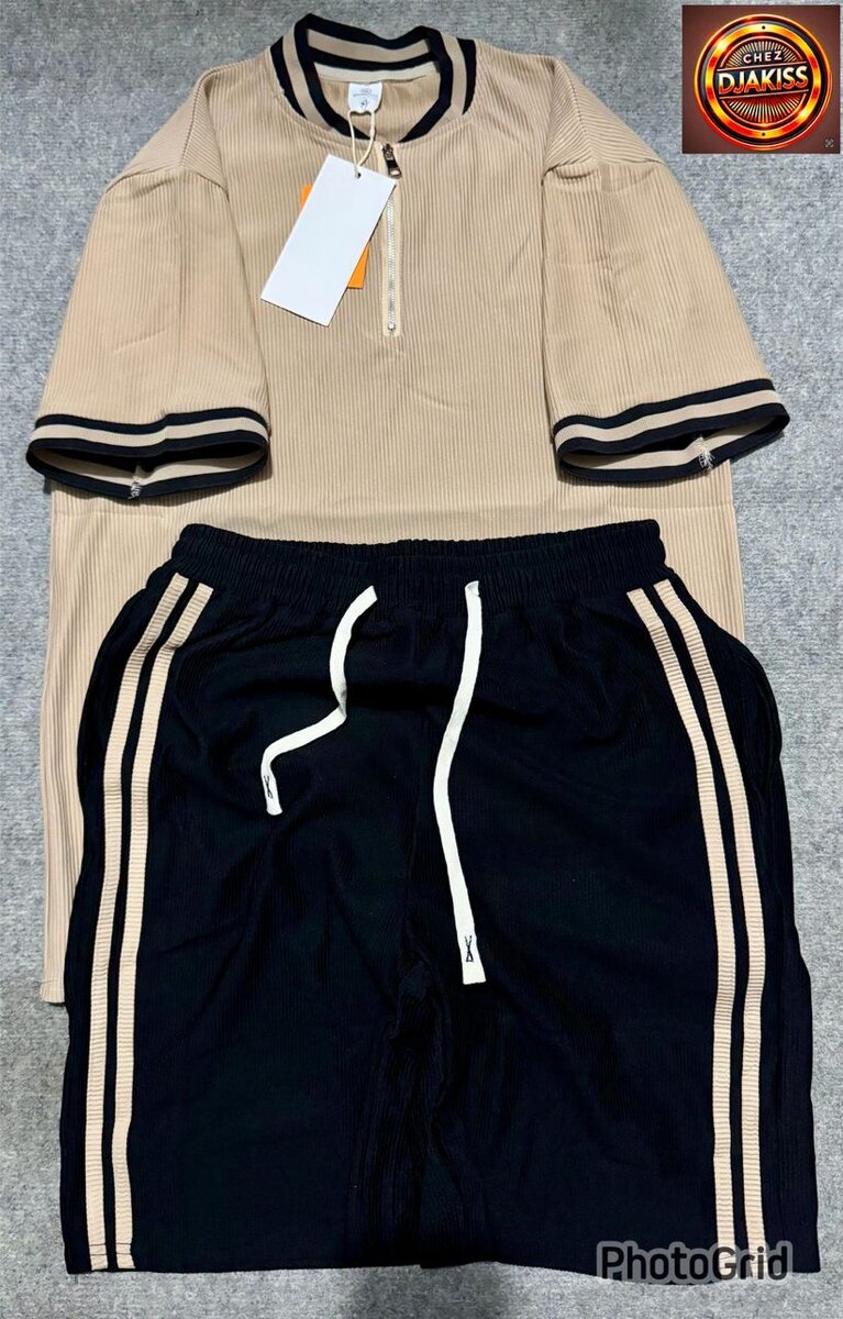 Découvrez cet ensemble sportif décontracté, idéal pour un look tendance et confortable. Le haut beige à manches courtes avec une fermeture éclair assure un style moderne, tandis que le short noir à rayures offre confort et flexibilité. Parfait pour les séances d'entraînement ou une tenue décontractée quotidienne.