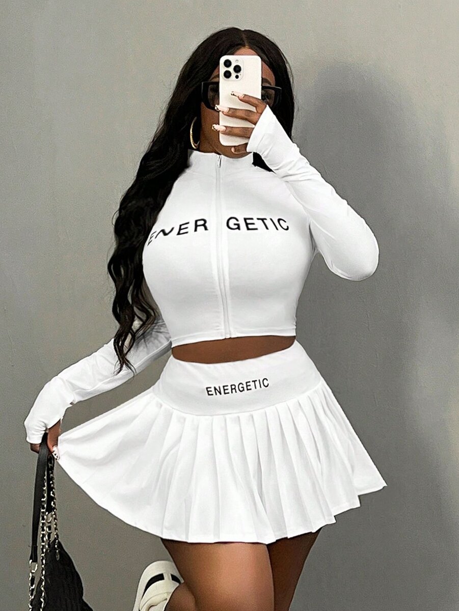 Ensemble sportif pour femme, composé d'un crop top à manches longues et d'une jupe plissée, idéal pour un style dynamique et tendance. Confortable et stylisé pour le sport ou la détente.