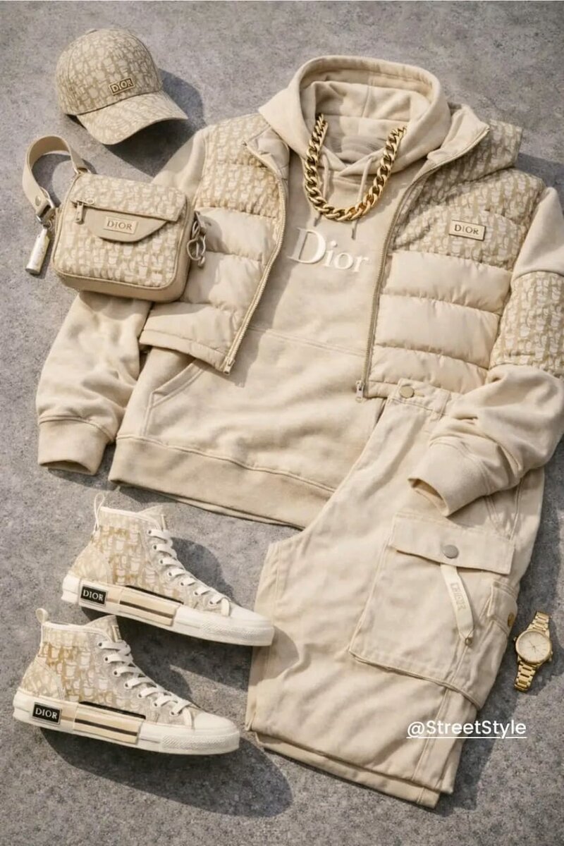 Découvrez cet ensemble streetwear sophistiqué en ton beige, parfait pour un look urbain et élégant. Inclut une veste matelassée, un sweat à capuche, un pantalon cargo, ainsi que des baskets montantes. Idéal pour ceux qui recherchent à la fois confort et style dans leurs tenues décontractées.