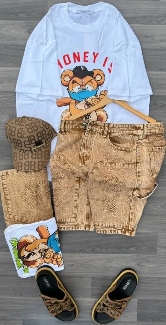 Optez pour un style unique avec cet ensemble streetwear tendance! Comprend un t-shirt imprimé ours stylé, un short en denim délavé, une casquette assortie et des claquettes confortables. Idéal pour une allure décontractée et branchée cet été. Parfait pour les sorties en ville ou les réunions entre amis. Faites-vous remarquer avec ce look exceptionnel!