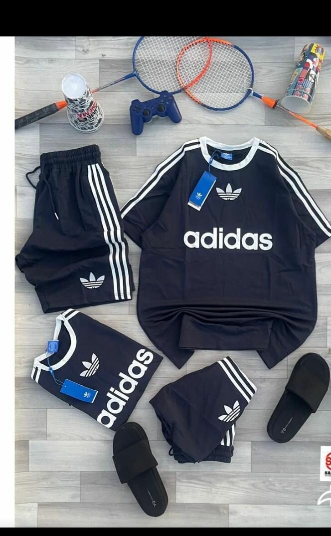 Survêtement adidas noir pour homme comprenant un t-shirt, un pantalon et des accessoires de sport. Conçu pour le confort et la performance.