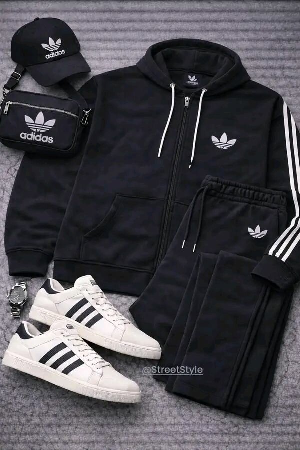 Découvrez cet ensemble survêtement Adidas noir élégant et confortable, comprenant un sweat à capuche, un pantalon et des accessoires assortis. Idéal pour le sport ou le style urbain.