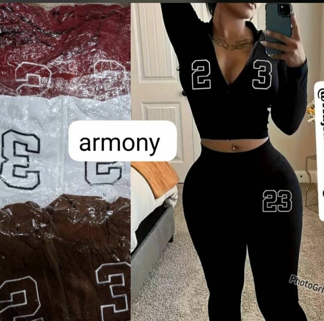 Découvrez cet ensemble survêtement Armony comprenant un haut court et un Leggings, idéal pour le sport ou le quotidien. Confortable et élégant.