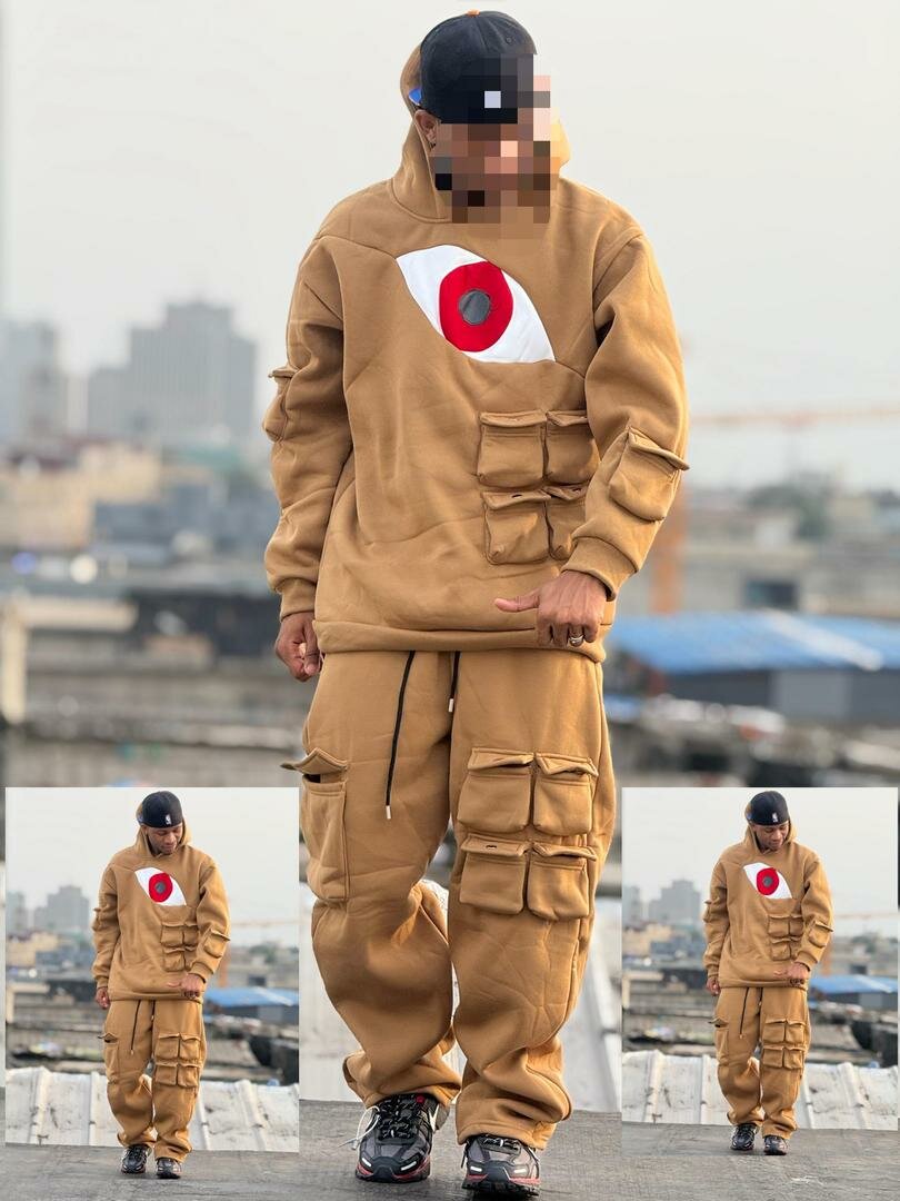 Survêtement cargo pour homme de couleur marron, composé d'un sweat à capuche avec motif et de pantalons cargo, parfait pour un look décontracté et tendance.